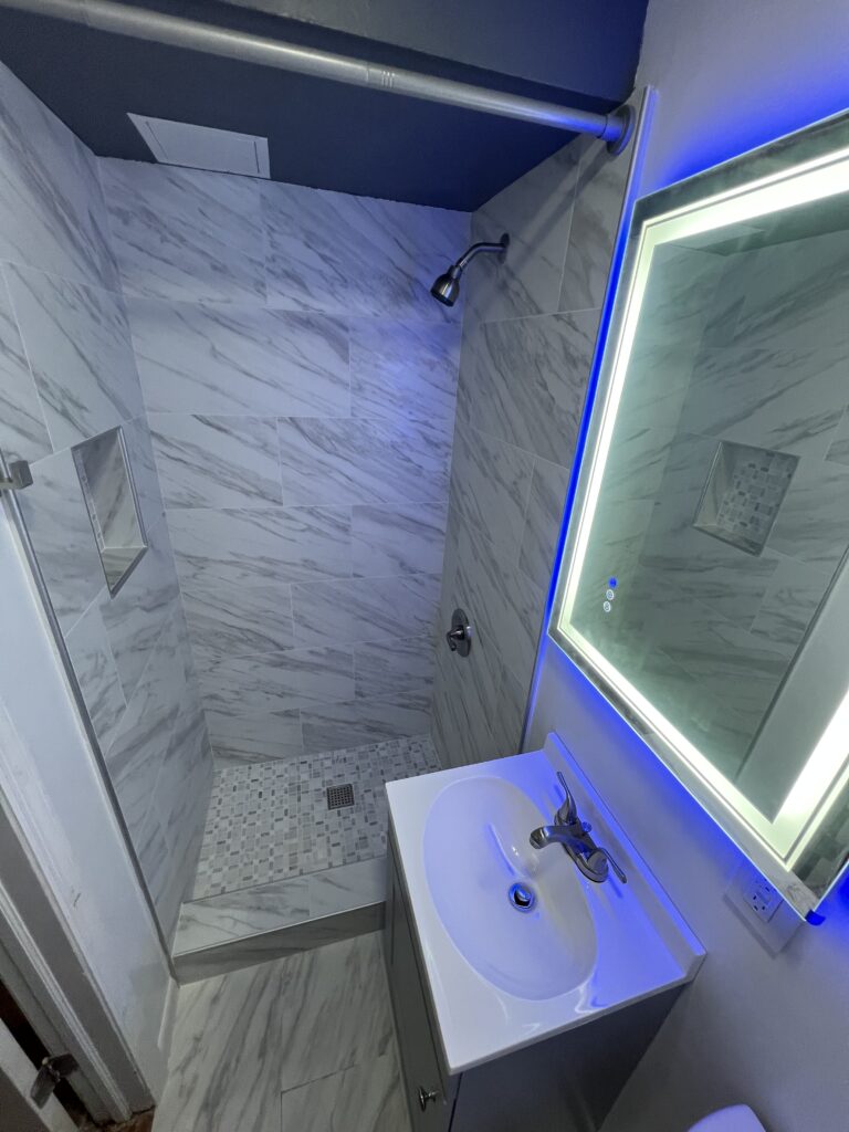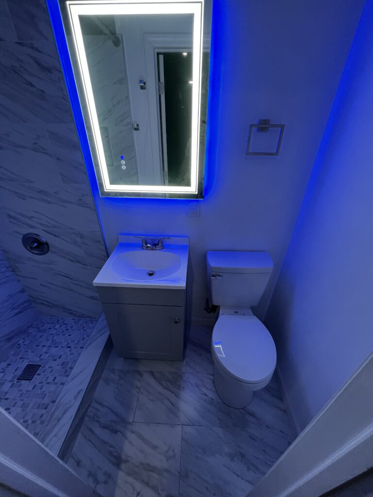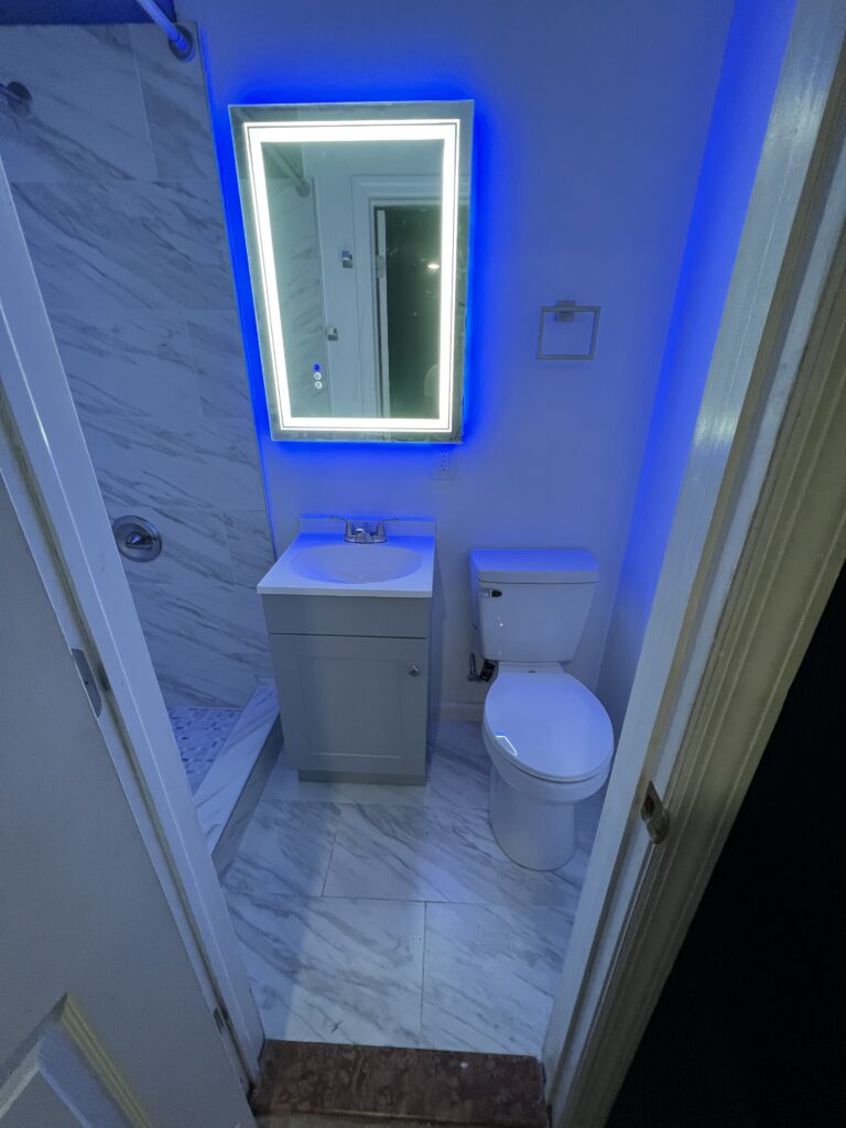 We installed a new vanity, updated faucet, modern fixtures, and a backlit LED mirror that adds both function and a sharp visual touch. The lighting and finishes were selected to make the room feel brighter and more open, even with limited square footage.